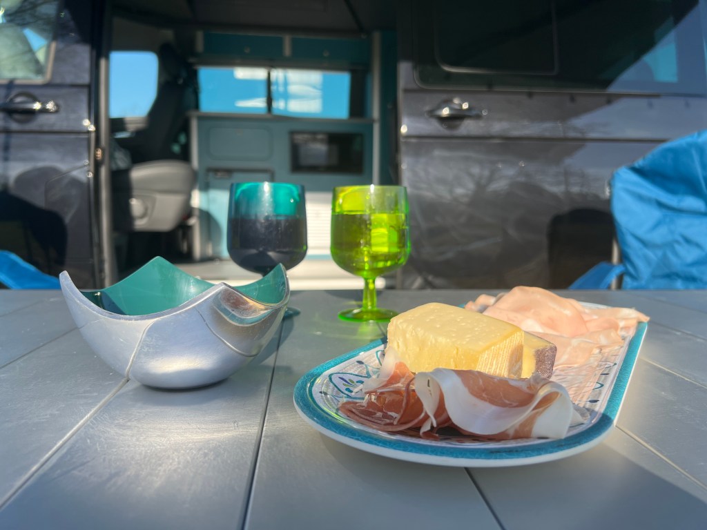We pulled into our campsite in South Vienna, and it was sunny and 24C. Yes, you read that right, there is no decimal point missing. Spring has officially sprung in central Europe. Is it an early gift from the Easter bunny? Mr G was very excited to wipe down the van, put on some shorts and fire up the Cadac. I was very excited to rock out my new solar-powered fairy lights and get the chance to showcase a few more teal van accessories. Each to their own.